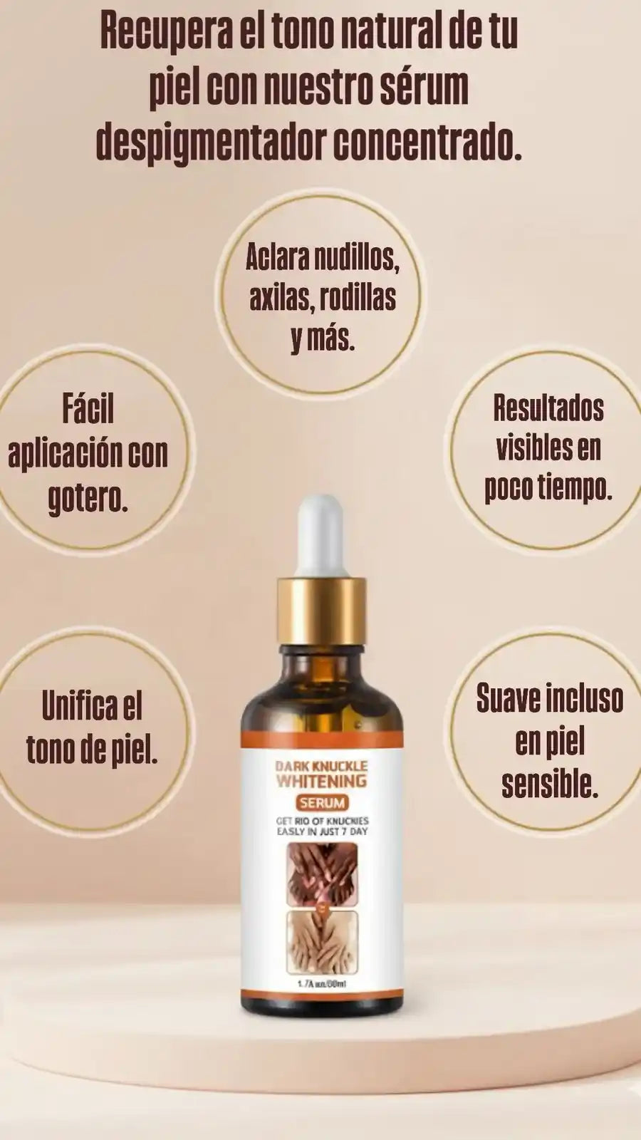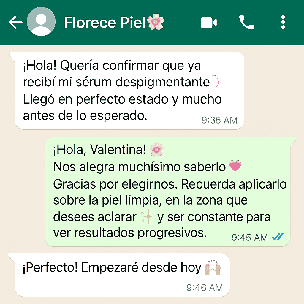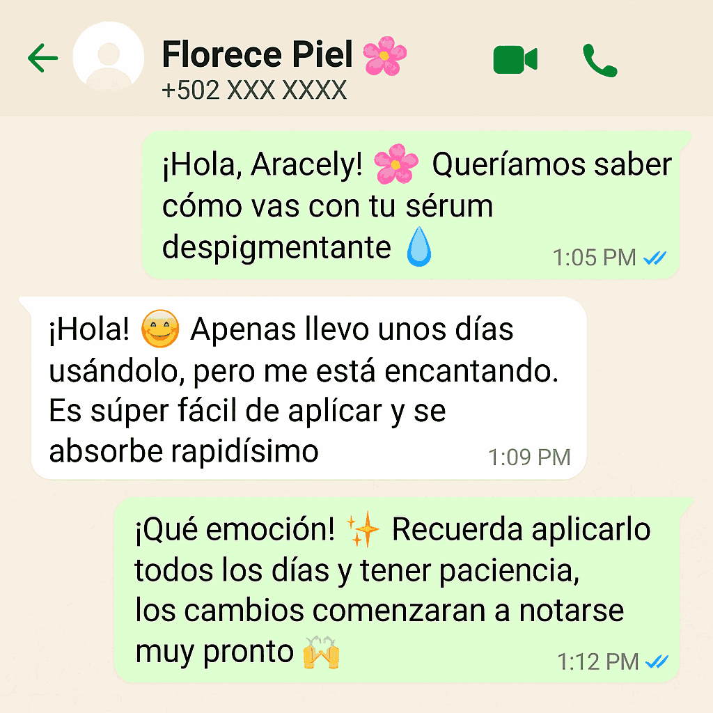 Desde las 2 primeras semanas de uso constante empezarás a notar la piel más uniforme, suave y con un tono más claro. El resultado completo puede variar según cada piel, pero la mayoría de nuestras clientas ve cambios significativos entre la semana 3 y 4. La clave está en aplicarlo todos los días, tal como se indica.