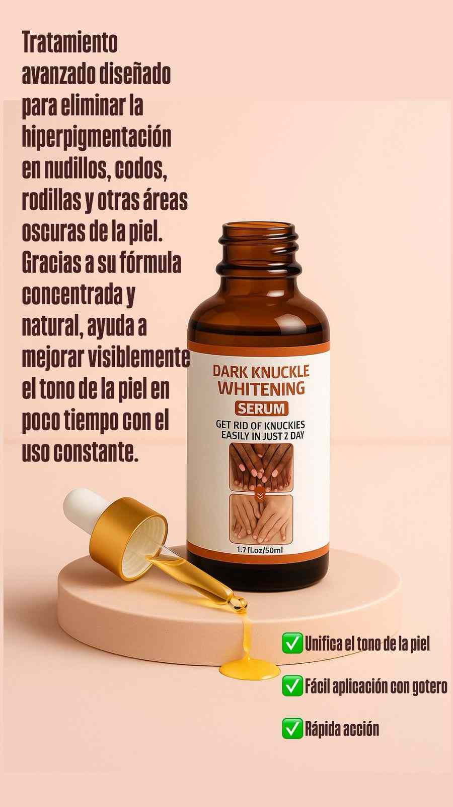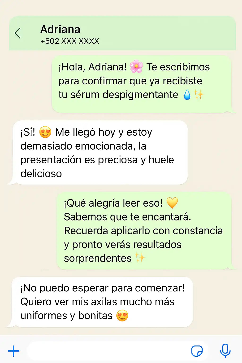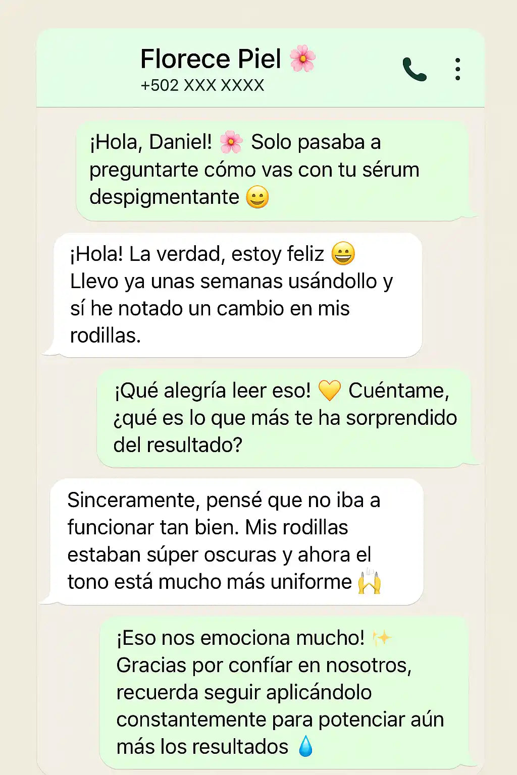 Desde las 2 primeras semanas de uso constante empezarás a notar la piel más uniforme, suave y con un tono más claro. El resultado completo puede variar según cada piel, pero la mayoría de nuestras clientas ve cambios significativos entre la semana 3 y 4. La clave está en aplicarlo todos los días, tal como se indica.